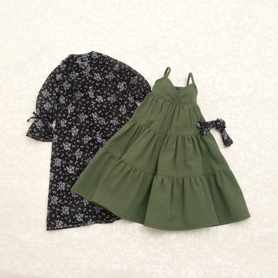 ロングジャケットにもなる軽やかシフォンワンピと、カジュアルな生地が魅力的なティアードワンピのセット。