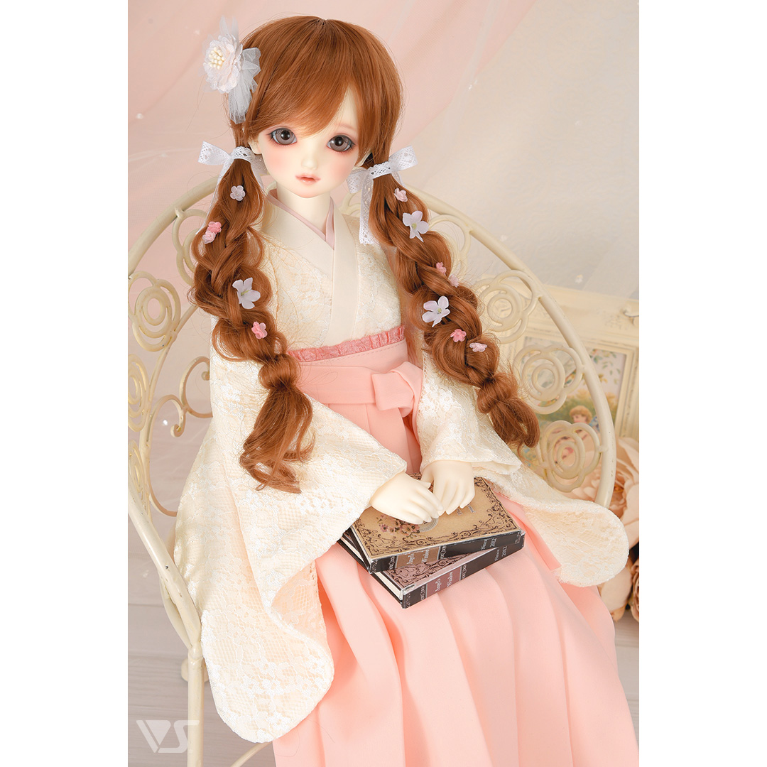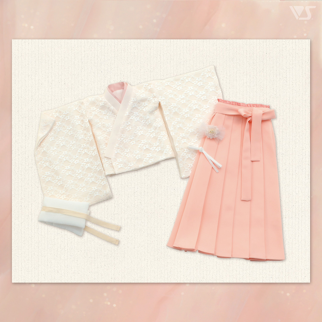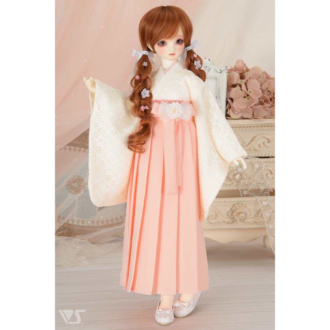 トップスの着物は、柔らかい色合いの生地の上に繊細なレースを重ねています。レースが下の生地に上品に馴染むよう、色の組み合わせを工夫しました。優しい肌触りの裏地もついているので、肌の色も透けにくくなっています。