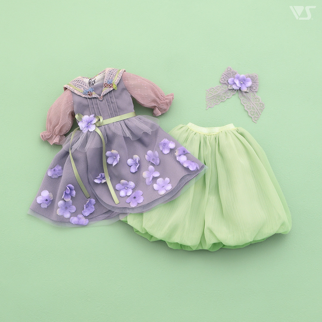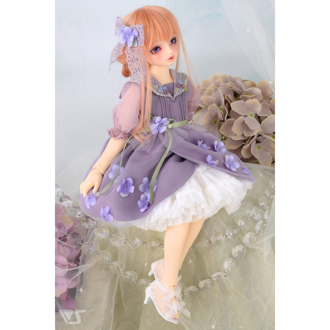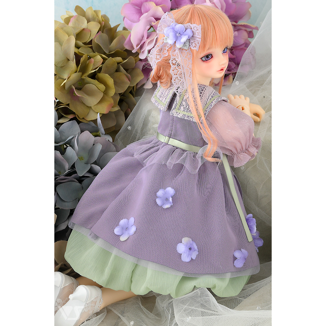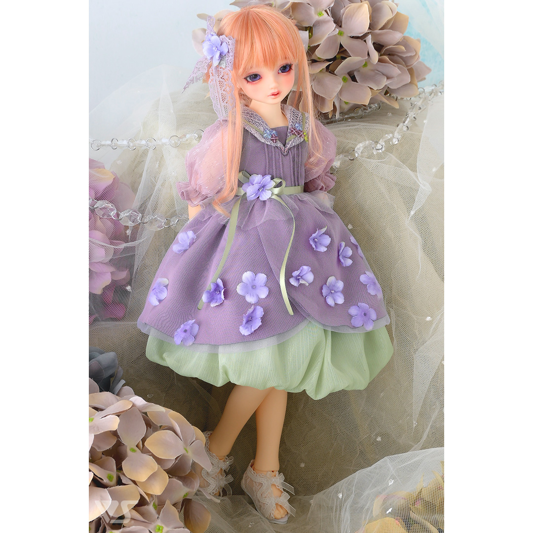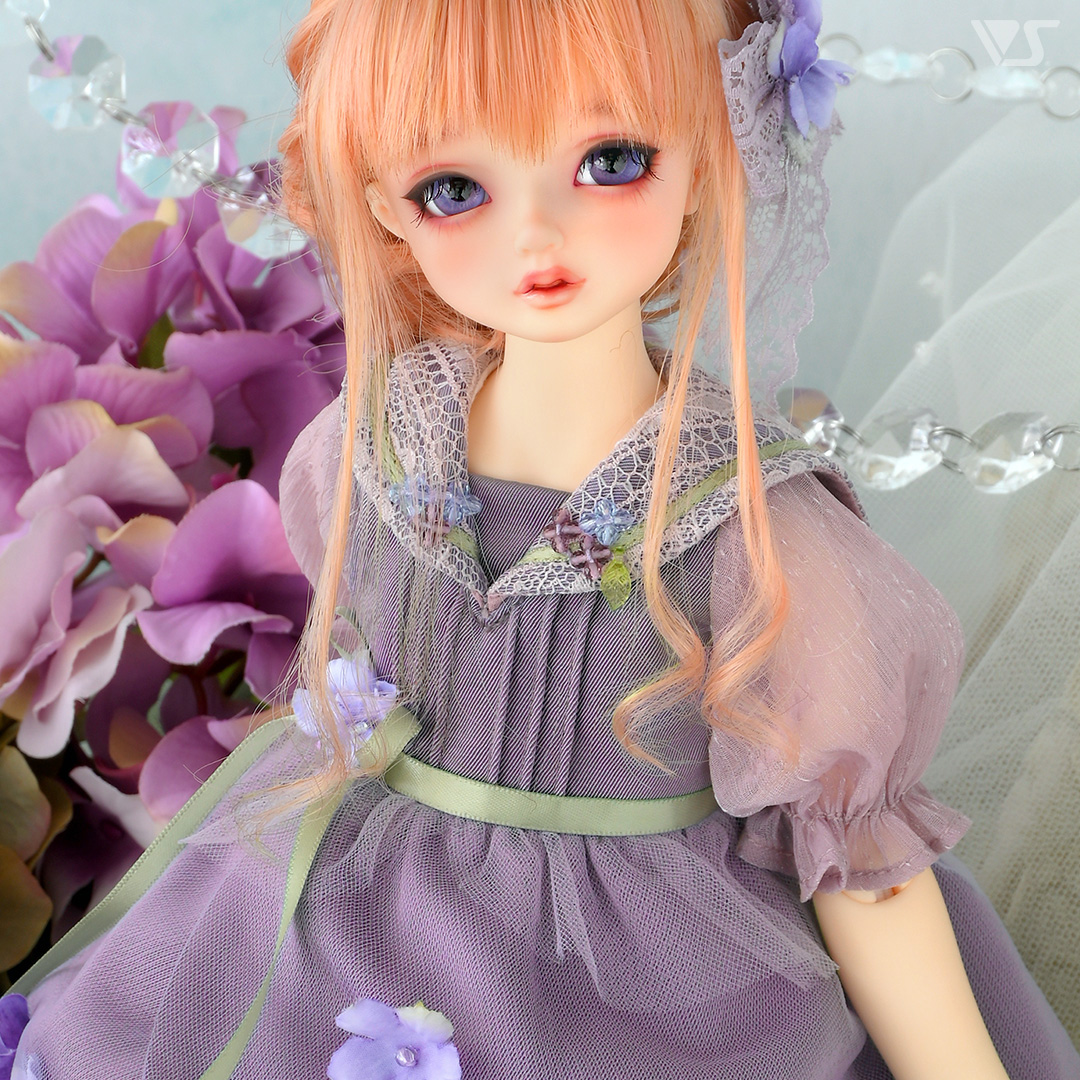 襟もとにあしらった紫陽花はすべて手縫いでお仕立てしています。水色と紫色の紫陽花にアクセントとして葉っぱのビーズをプラス。雨のしずくを帯びたような、きらきらとした輝きはドルフィーのお顔を華やかに演出してくれます✿
