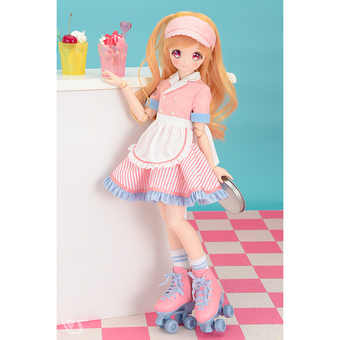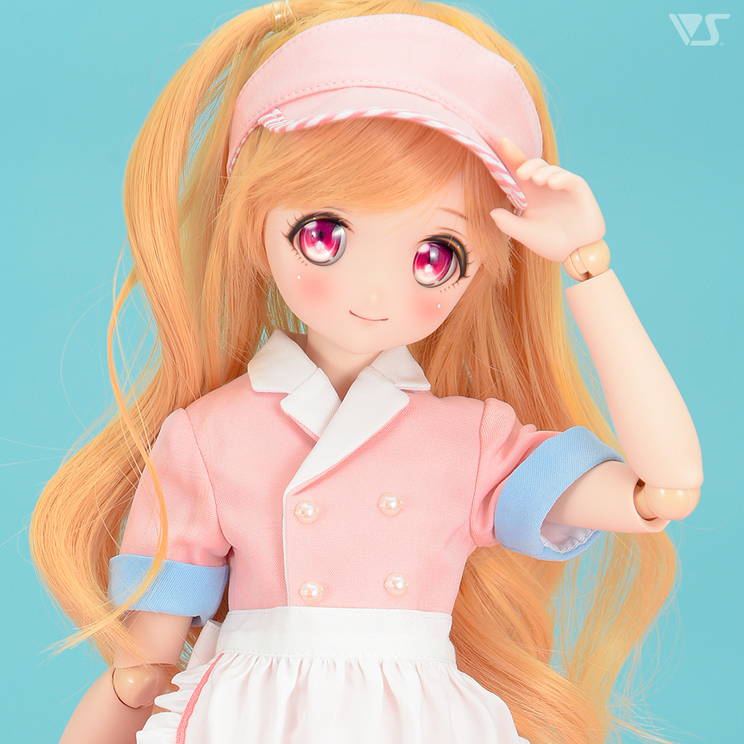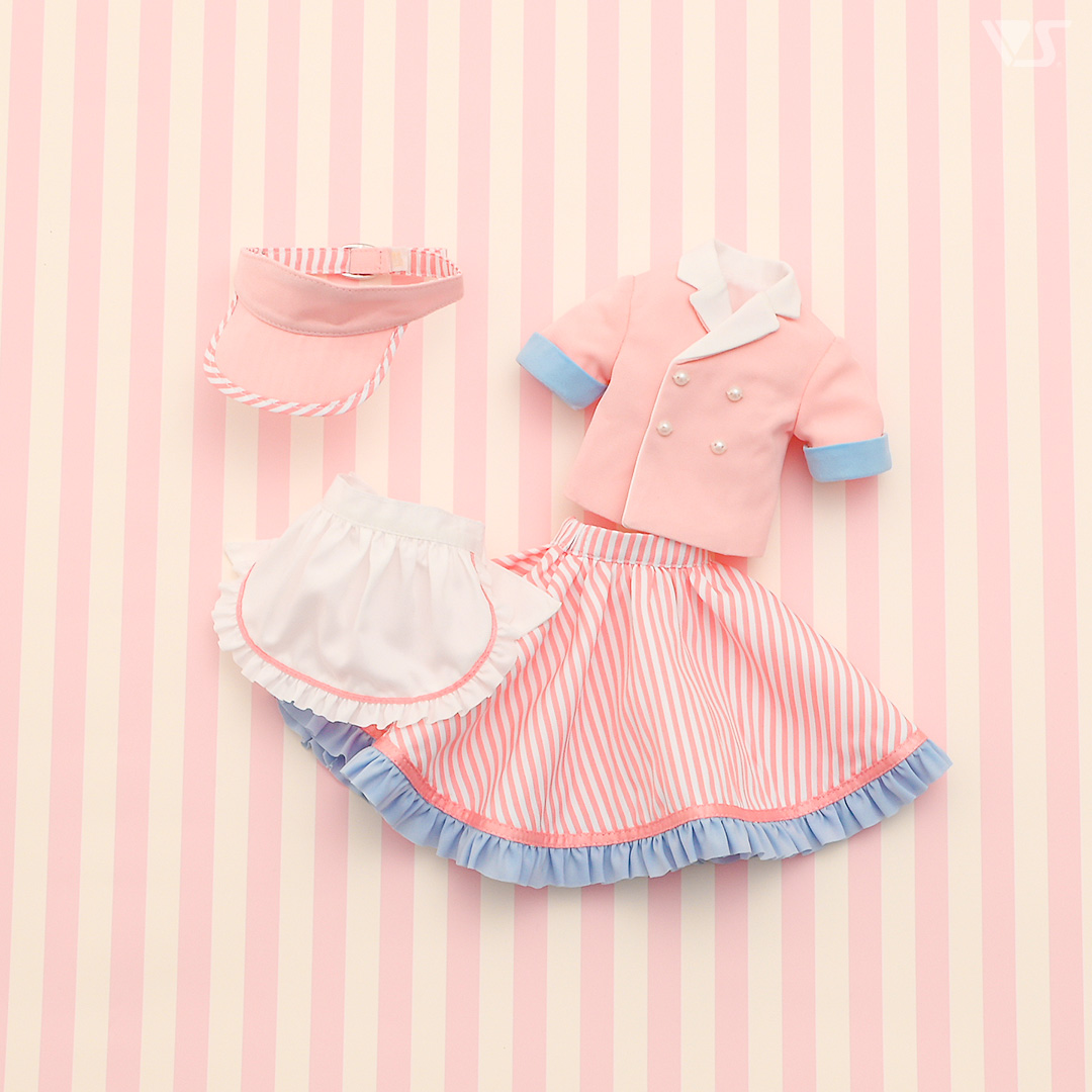 甘くてかわいいサンデーをイメージしたカラーでまとめました。ちょっぴりレトロなトップスのダブルの合わせや、スカートやエプロンのフリフリとしたフリルがポイントです。サンバイザーの後ろはバックルでサイズ調整ができるので、MDDもSDMにもぴったり♪MDDはもちろん、SDMが着てもとっても可愛いですよ♥