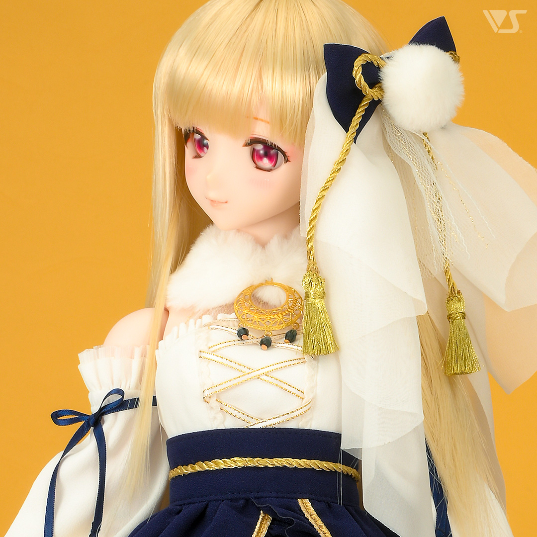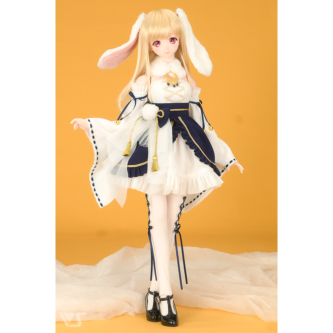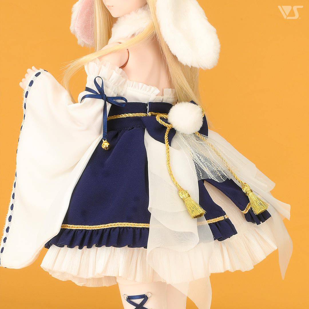 うさぎのように真っ白な生地をメインに、紺色のポイントが入った和風ドレスです。
