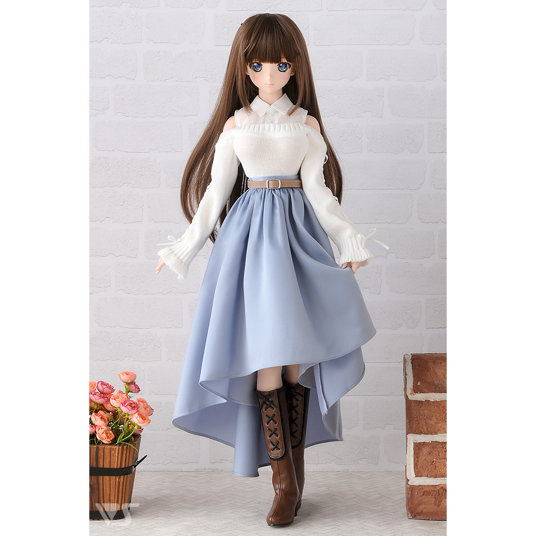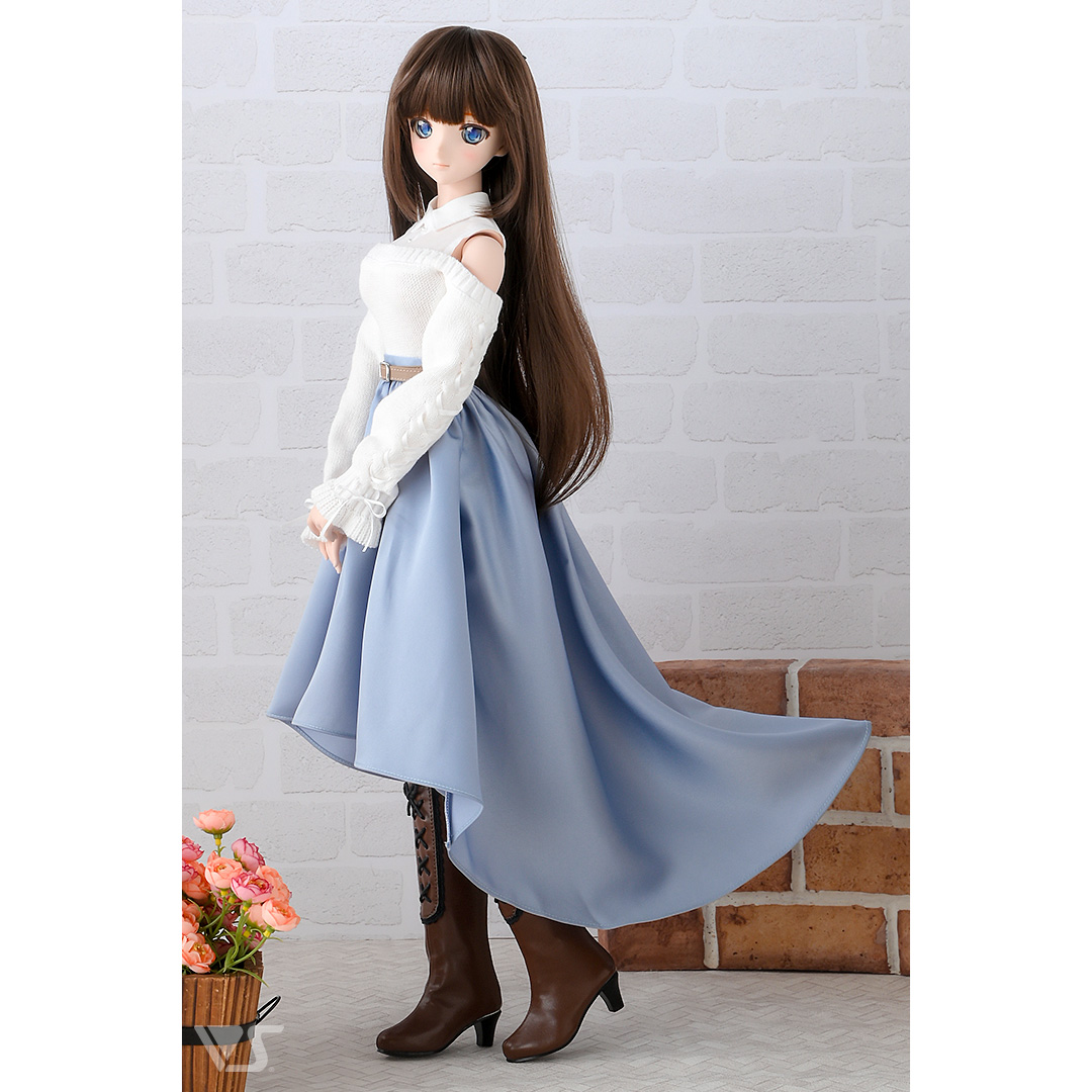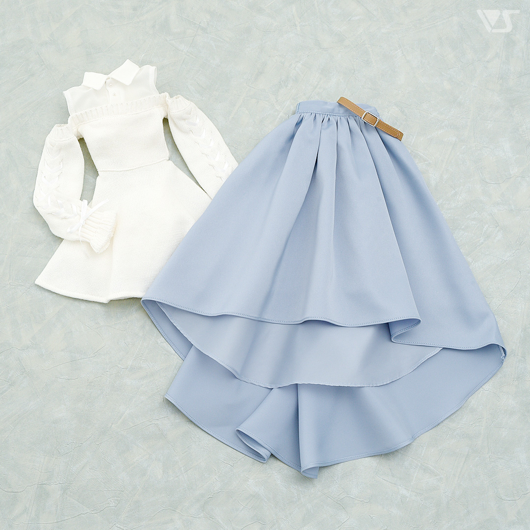 肩出しデザインがかわいい真っ白なセーターとくすみブルーのフィッシュテールスカートの、あざとさと上品さが共存した秋にぴったりのコーディネートです。