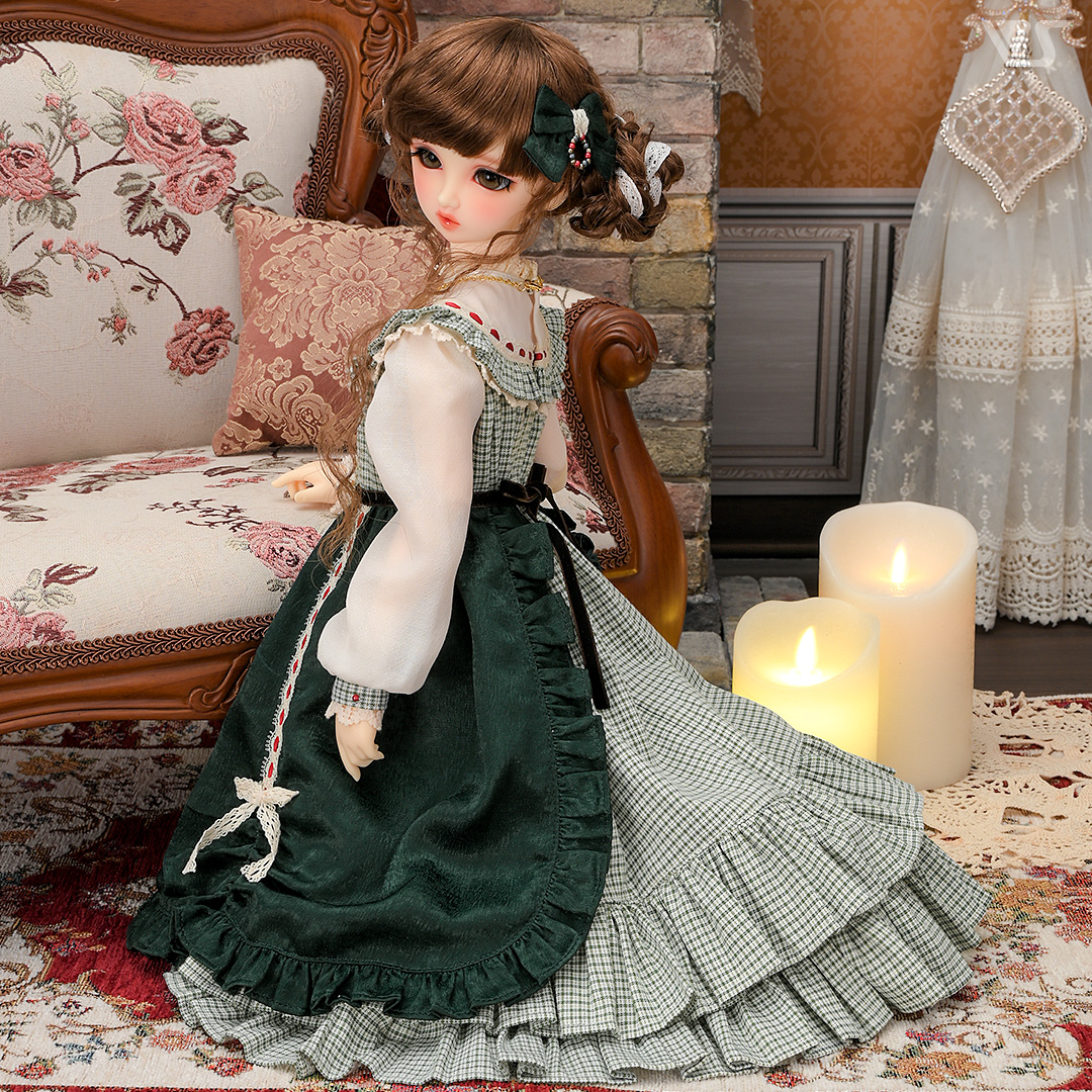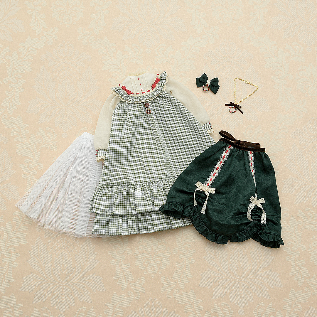 ゆったりふんわりと広がるシルエットがとってもかわいらしいワンピースは、よく見ると生地がキラキラしています!光沢感のある生地のオーバースカートや、「エプロン&バブーシュカセット(ベリー)」を合わせてコーディネートするのも素敵ですよ♪