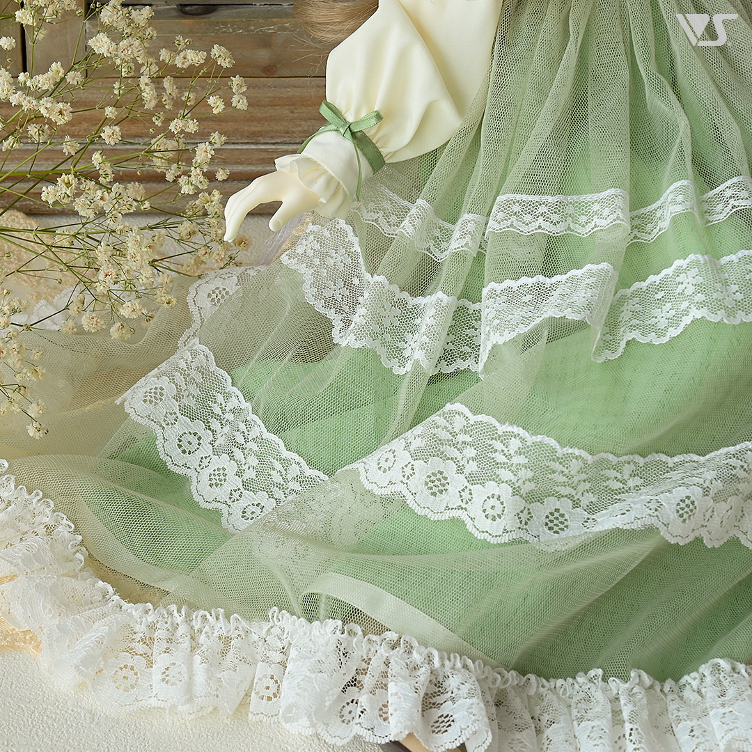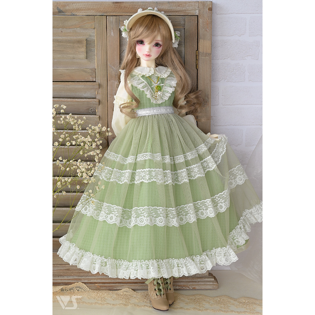 大きな葉を想わせる落ち着いたグリーンに、小さく慎ましやかに咲くすずらんのお花がネックレスやストリーボンネットにあしらわれています。レースとチュールたっぷりのオーバースカートとストロー素材のボンネットに、別売りの「チュールブーケパニエ」をあわせればクラシカルで華やかな印象のドレスとして。また、ワンピースのみで着用するとすこしカジュアルな印象にかわり、気分やシチュエーションで変化を楽しむことができますよ♪