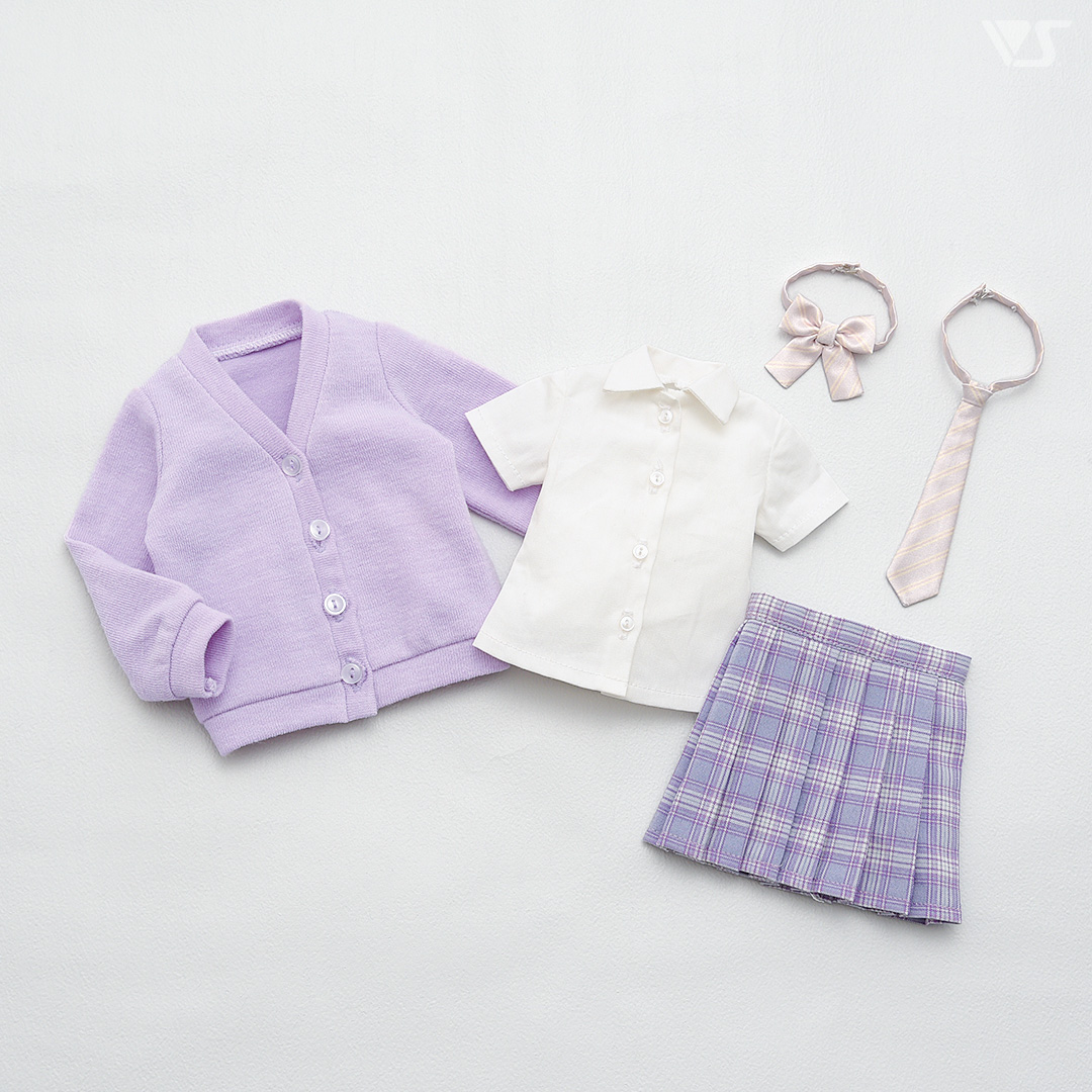 パステルなカラーリングがキュートな「女子高生セット(紫)・ミニ」は、タイを緩めたり、カーディガンを腰に巻いたりと様々な着こなしを楽しむことが出来ます。