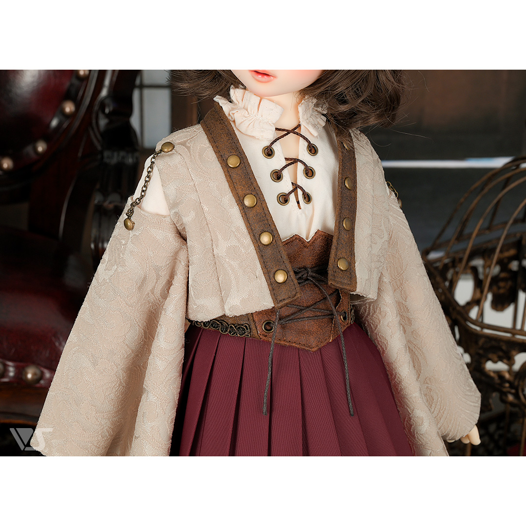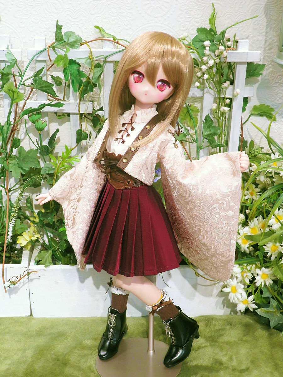 着物の特徴である袖や襟のデザインは残しつつ、くすんだ色合いの生地や合皮、アンティークゴールドのパーツを使用し、和風とスチームパンクの要素を合わせたドレスに仕上げました。SDMサイズは可愛らしいイメージになるよう、ミニ丈のプリーツスカートデザインにしました。フルセットで着せた際に、ワンピースの裾フリルがプリーススカートの裾からチラッと覗くのがポイントです。