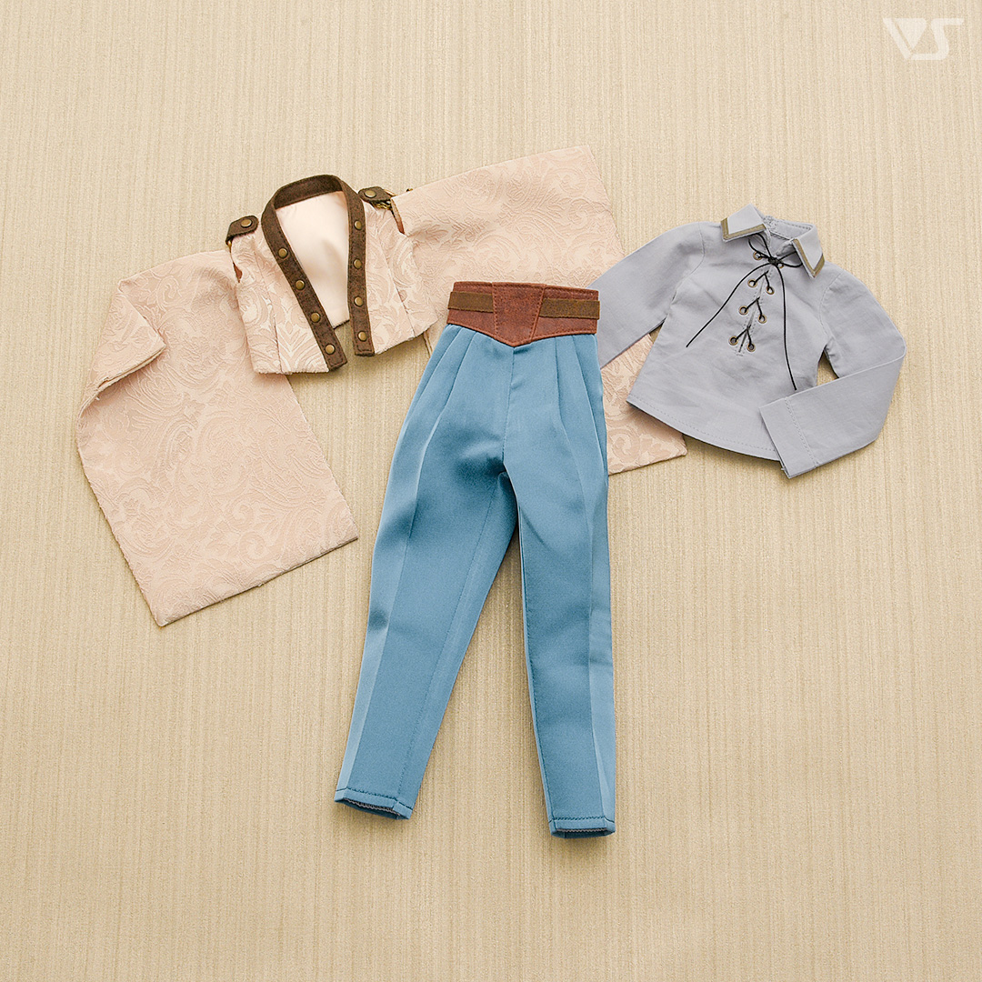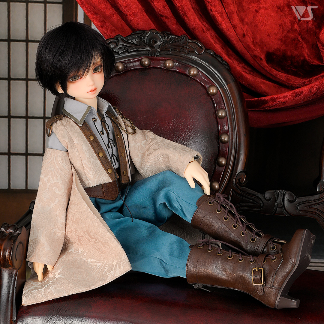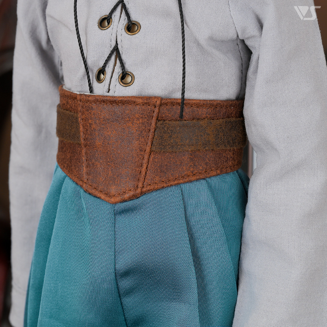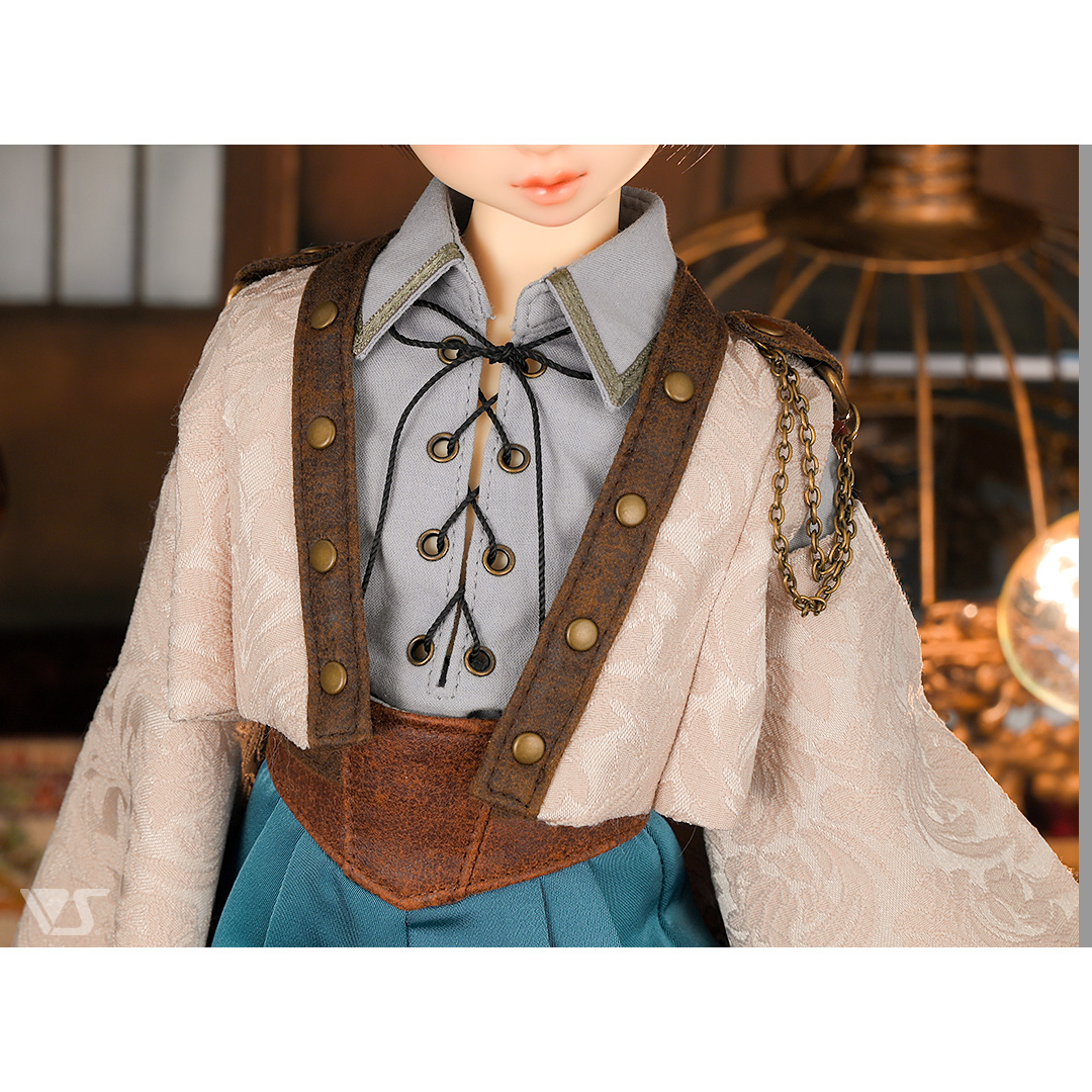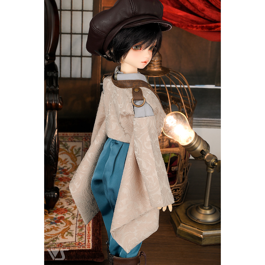 着物の特徴である袖や襟のデザインは残しつつ、くすんだ色合いの生地や合皮、アンティークゴールドのパーツを使用し、和風とスチームパンクの要素を合わせたドレスに仕上げました。SDMBサイズは、同シリーズの女の子ドレスとも相性が良いくすんだ青色でまとめました。コルセット風のデザインが入ったパンツのため、履くだけで引き締まったイメージになりますよ。