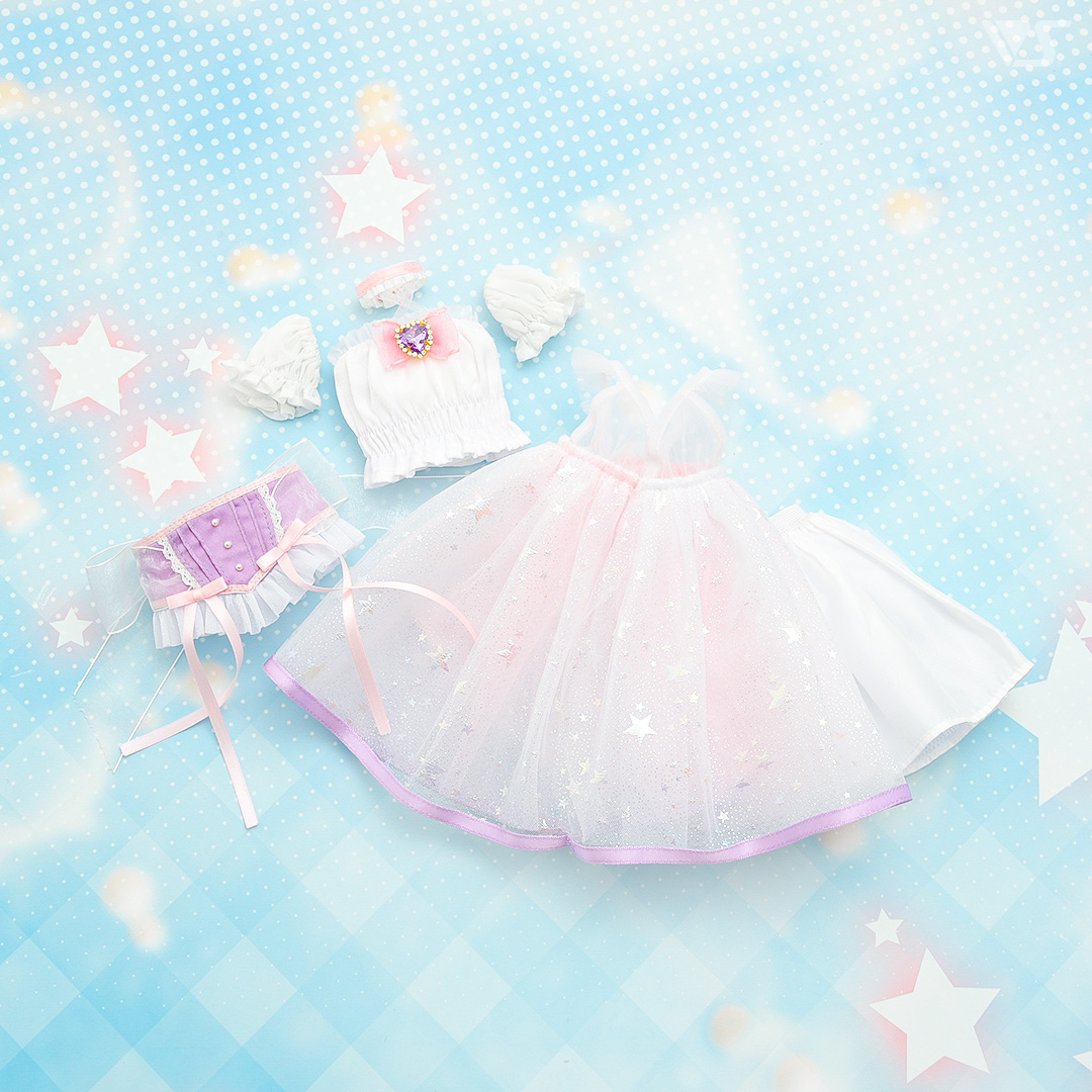 見る角度によって、スカートの色合いやお星さまの輝きが違って見える、まさにドリーミィなドレスセットです☆