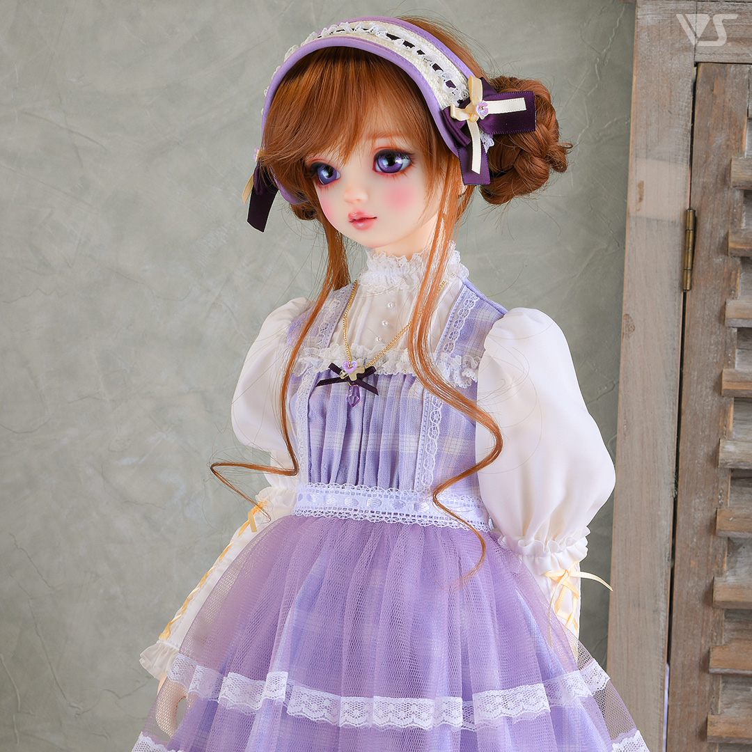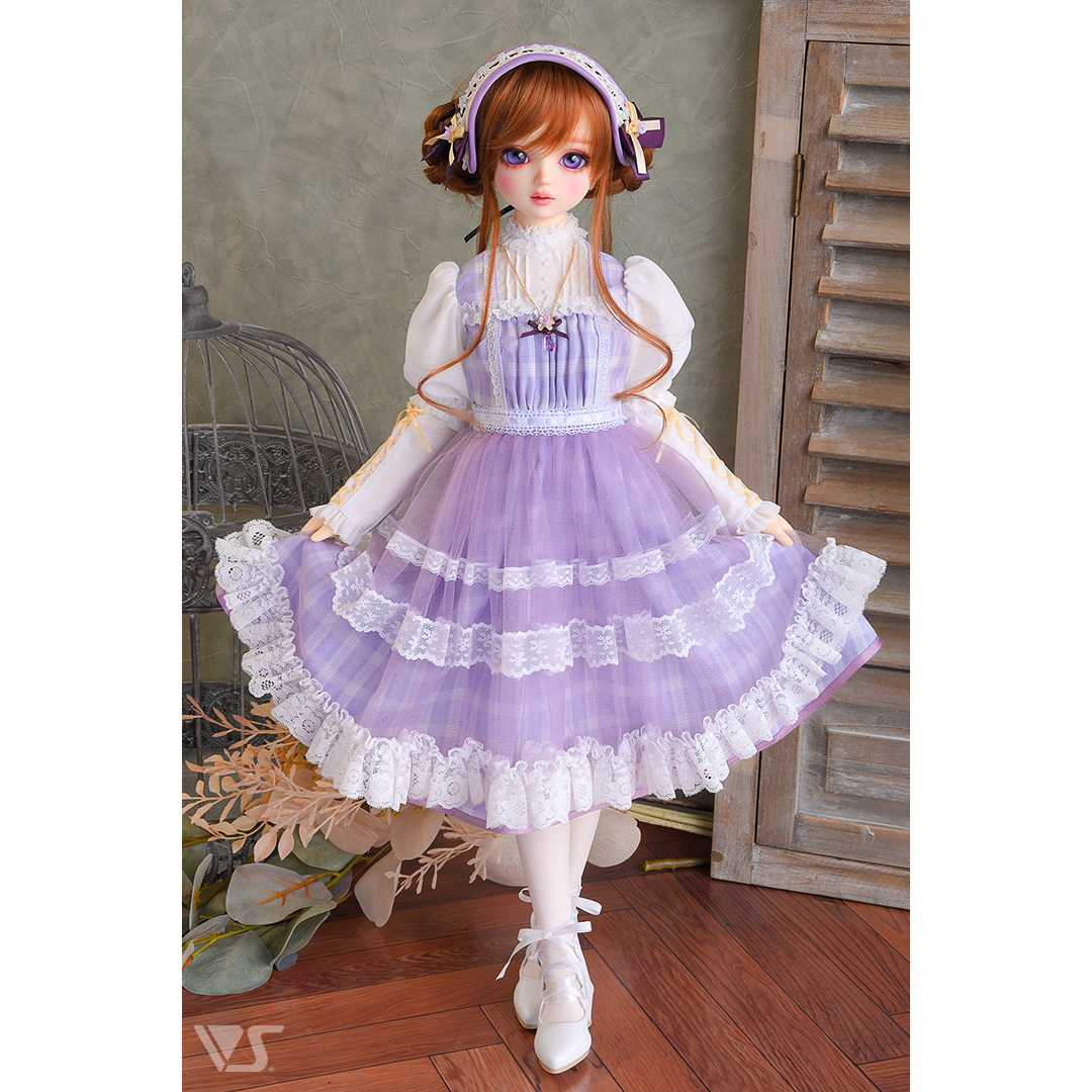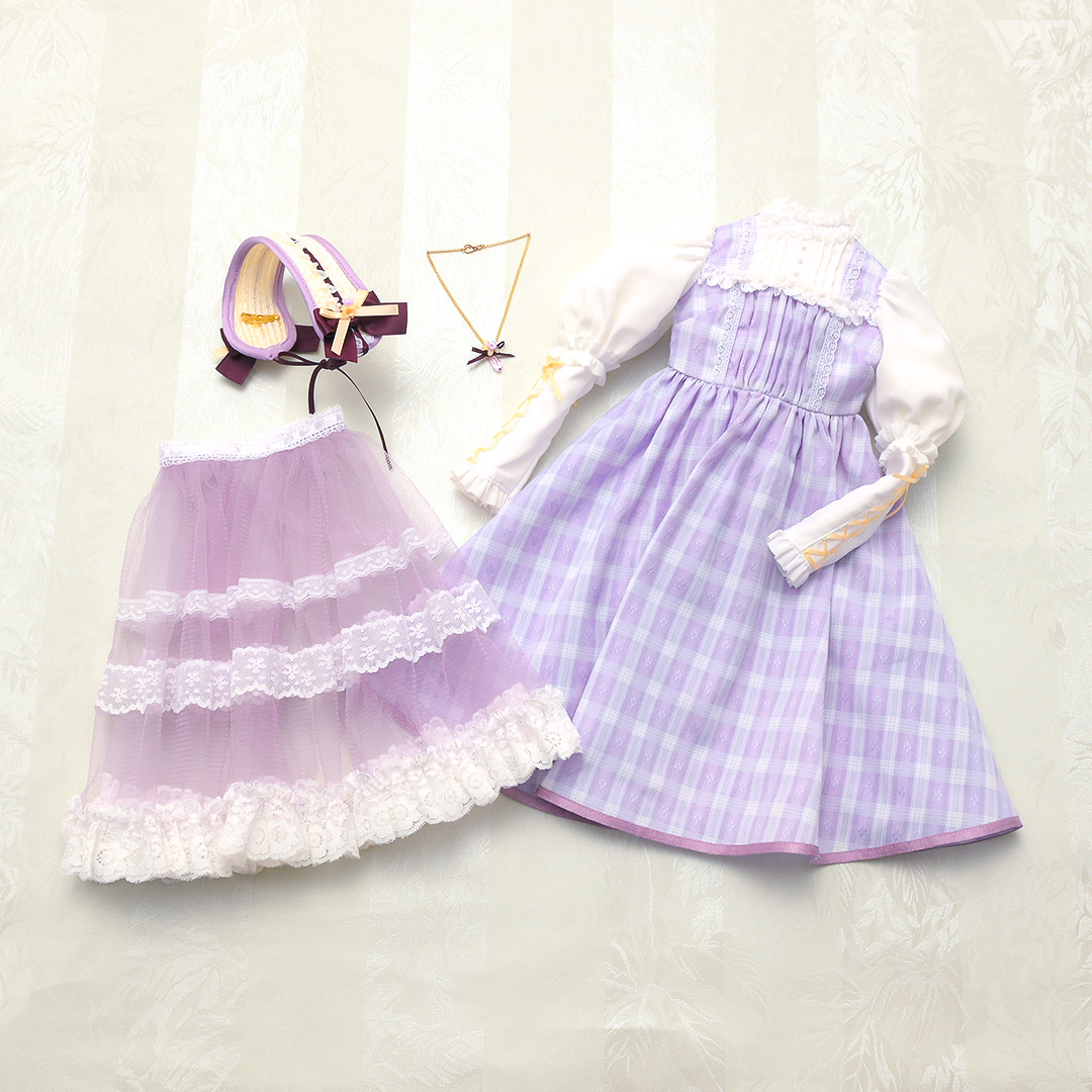 ・すみれカラーのチェック生地に黄色のアクセントを利かせた愛らしいワンピース。リボンの編み上げで飾ったパフスリーブもキュート♪ ・ネックレスにはすみれモチーフにドロップカットのビーズがきらめきを与えます。 ・色の異なるリボンとすみれをあしらったヘッドドレス