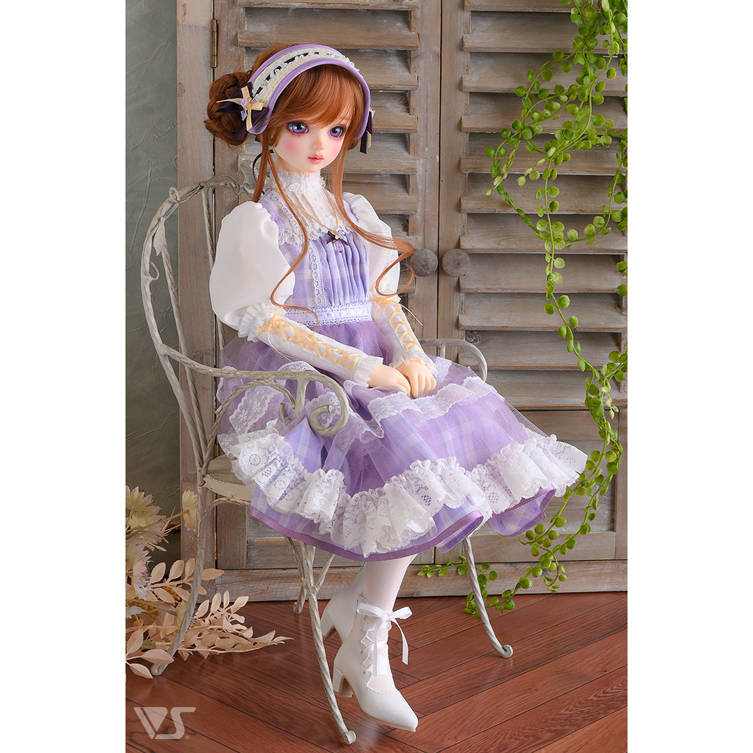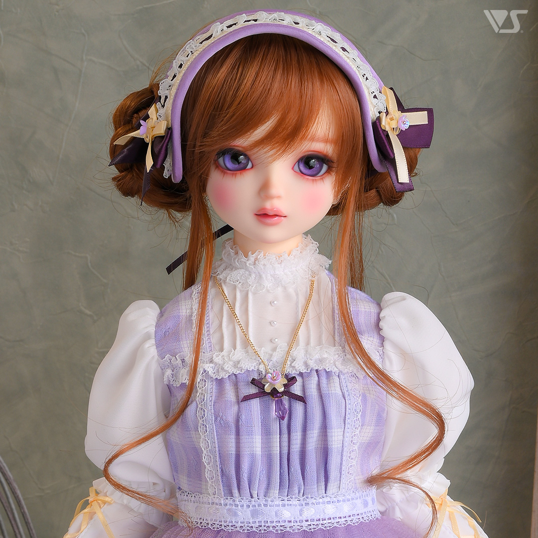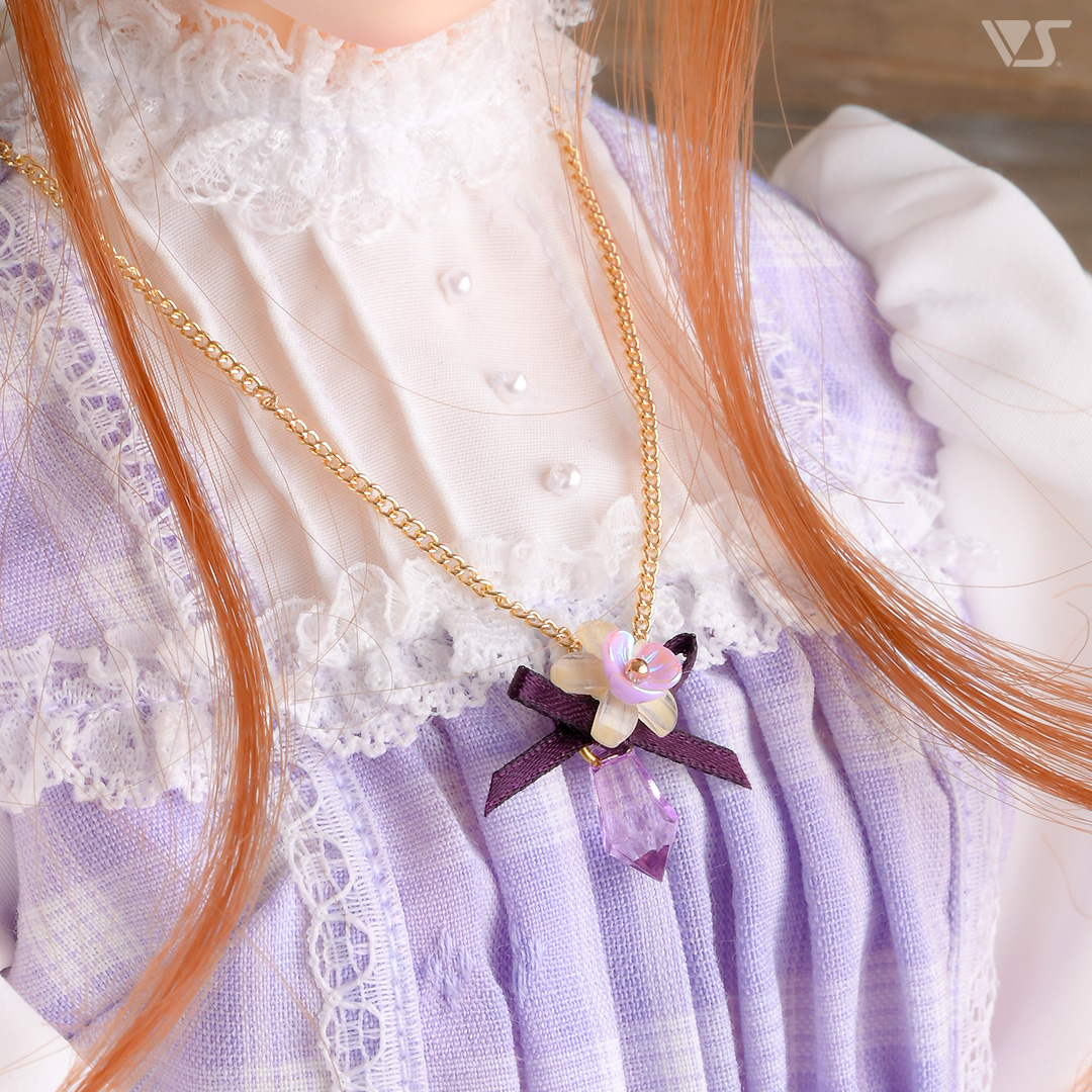 ・すみれカラーのチェック生地に黄色のアクセントを利かせた愛らしいワンピース。リボンの編み上げで飾ったパフスリーブもキュート♪ ・ネックレスにはすみれモチーフにドロップカットのビーズがきらめきを与えます。 ・色の異なるリボンとすみれをあしらったヘッドドレス