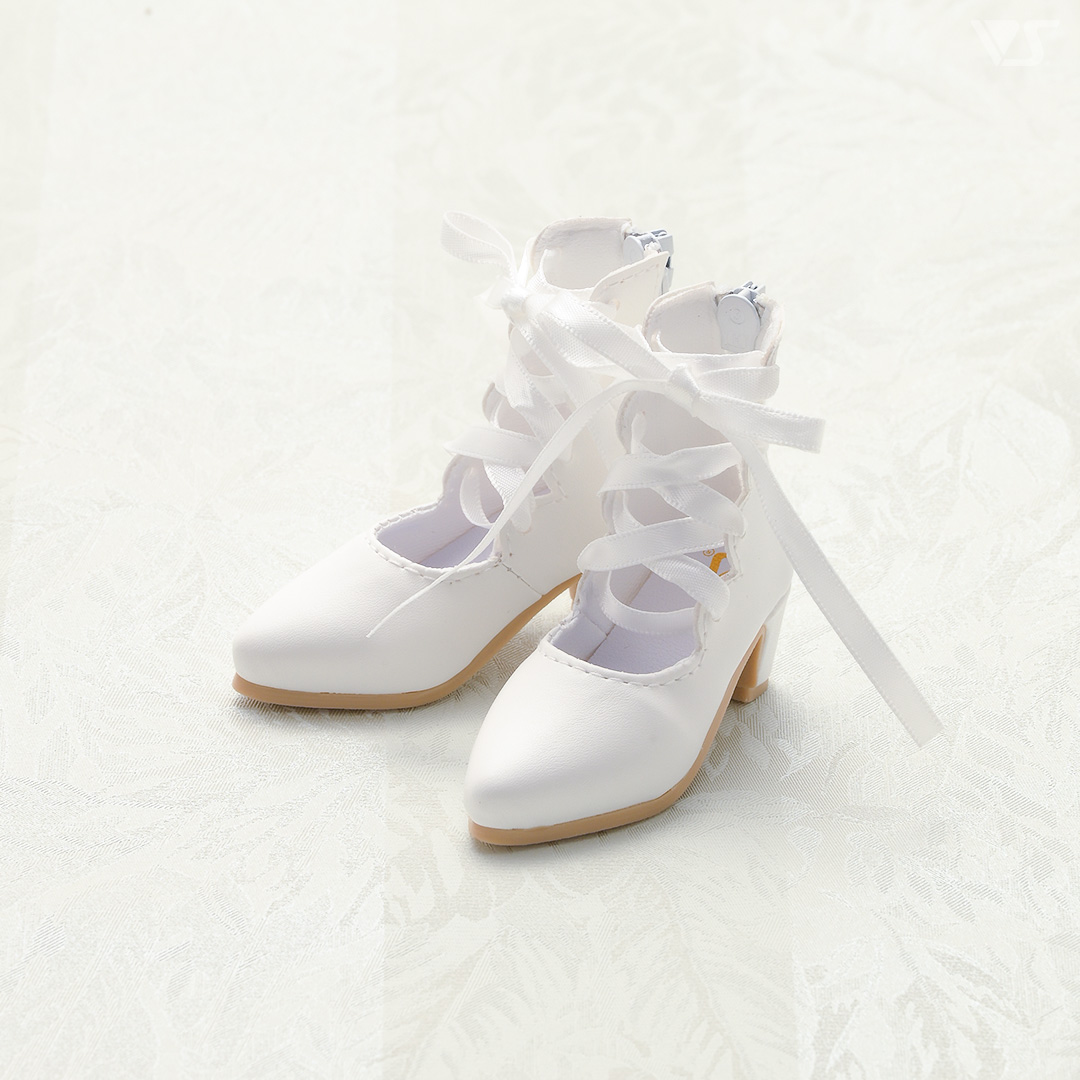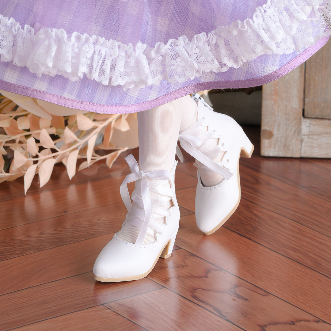 真っ白なリボン編み上げが可憐なシューズ。 後ろジッパーで簡単に履かせられます。