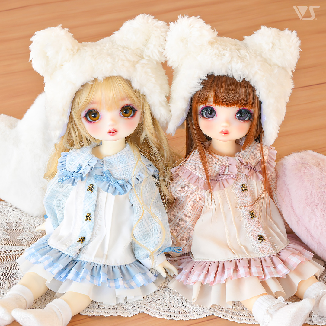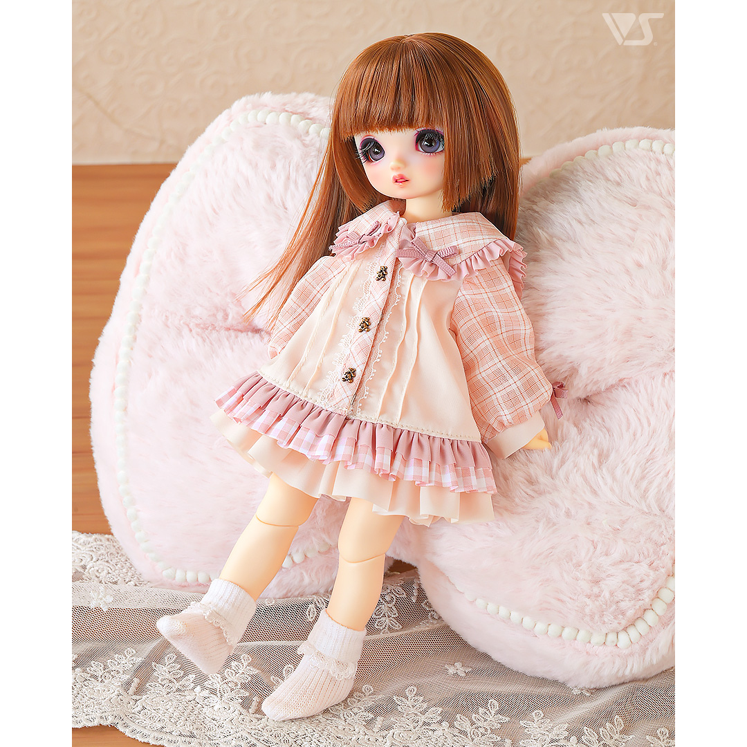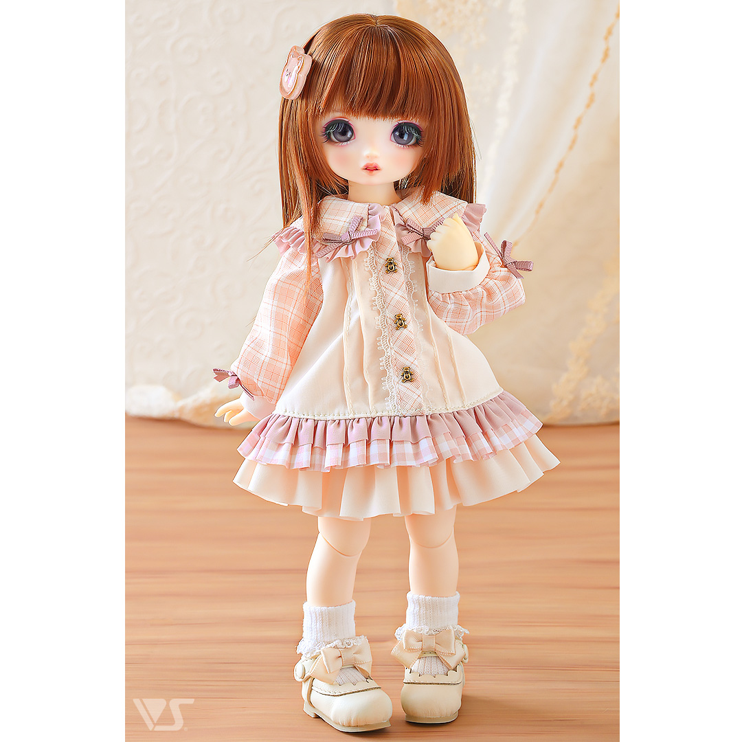 くまさんモチーフのセーラー襟にフリルたっぷりの裾がふんわり広がりとびきりキュート♡ちいさなくまさんボタンや柔らかいピンクチェック柄のかわいさがぎゅっと詰まったワンピースです。同時販売の「くま耳帽子(バニラ)・ちび」と合わせるとより可愛さUP!
