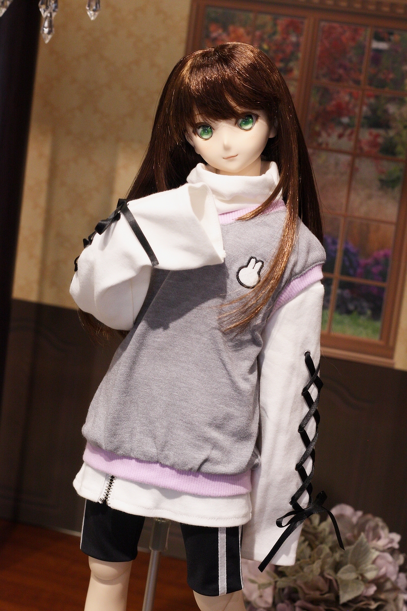 グレー×パープルのベストに、萌え袖の編み上げリボン、トップスの裾にさりげなくあしらわれたチャックがちょっぴりダークでとってもキュート♪