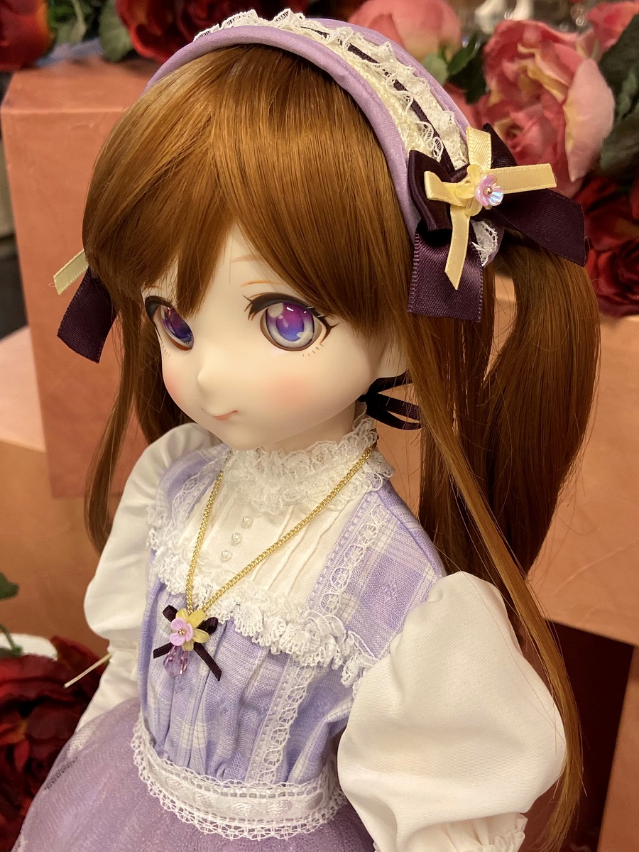 すみれ色のチェック生地がかわいらしいドレスですが、セットのアクセサリーにもご注目ください!紫に黄色のリボンを合わせた豪華なヘッドドレスに、細かなモチーフが重なり合ったネックレスがあなたのドルフィーを更に彩ります♪