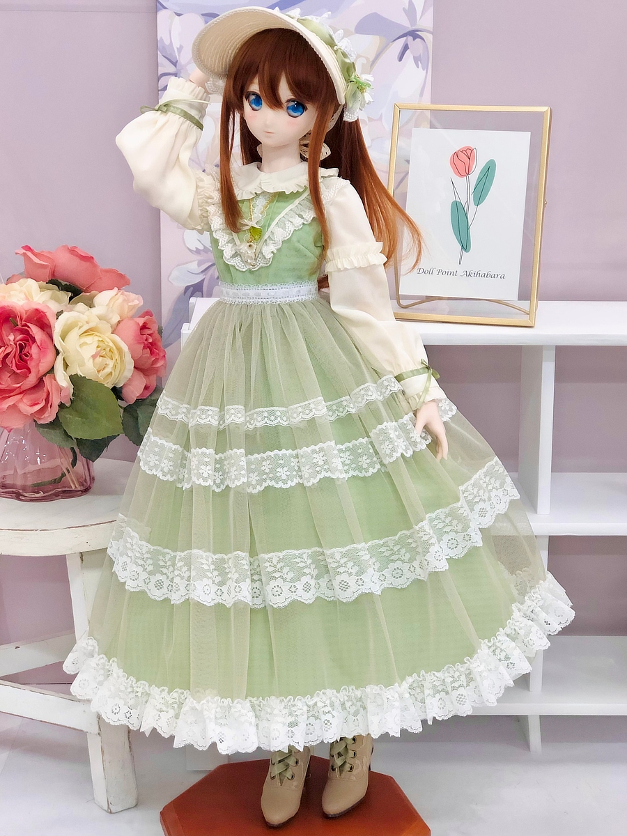 大きな葉を想わせる落ち着いたグリーンに、小さく慎ましやかに咲くすずらんのお花がネックレスやストリーボンネットにあしらわれています。レースとチュールたっぷりのオーバースカートとストロー素材のボンネットに、別売りの「チュールブーケパニエ」をあわせればクラシカルで華やかな印象のドレスとして。また、ワンピースのみで着用するとすこしカジュアルな印象にかわり、気分やシチュエーションで変化を楽しむことができますよ♪