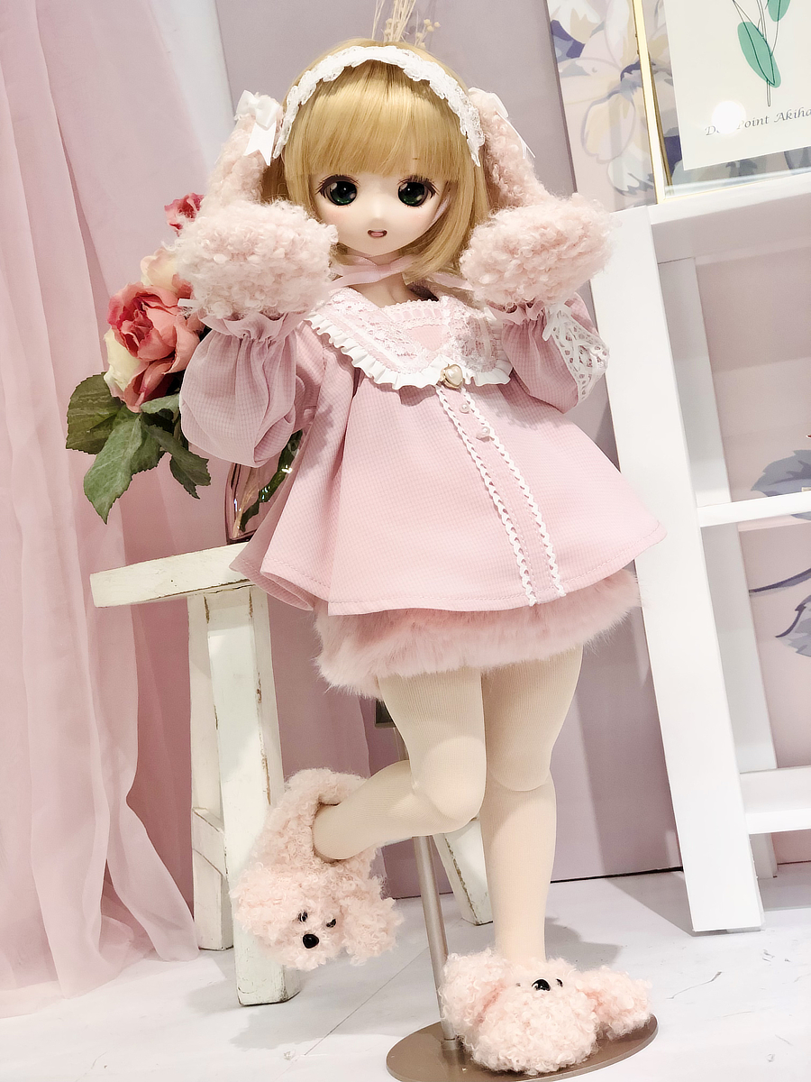 手袋とつけ耳と同じファー素材の「プードルルームスリッパ(別売)」とあわせて全身プードルコーデもとってもキュート♪お部屋でのひと時を可愛く彩ります。ワンピース襟元や袖のフリルに加え、裾のドレープも可愛いポイント!もこもこのファーパンツがのぞくようにキレイに拡げてあげると引き立ちますよ♪