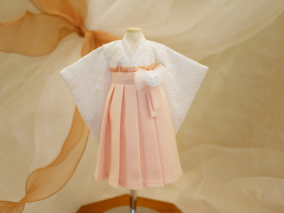柔らかなピンク色は、まさに春にピッタリの装い。繊細なレース生地が砂糖菓子のような甘さでドルフィー達を包んでくれます。まさに春の妖精といった雰囲気のドレスでおうちの子達を着飾ってあげると、とっても素敵だと思います。付属のリボン飾りはヘアアクセサリーとして、また帯のところにつけてあげても◎