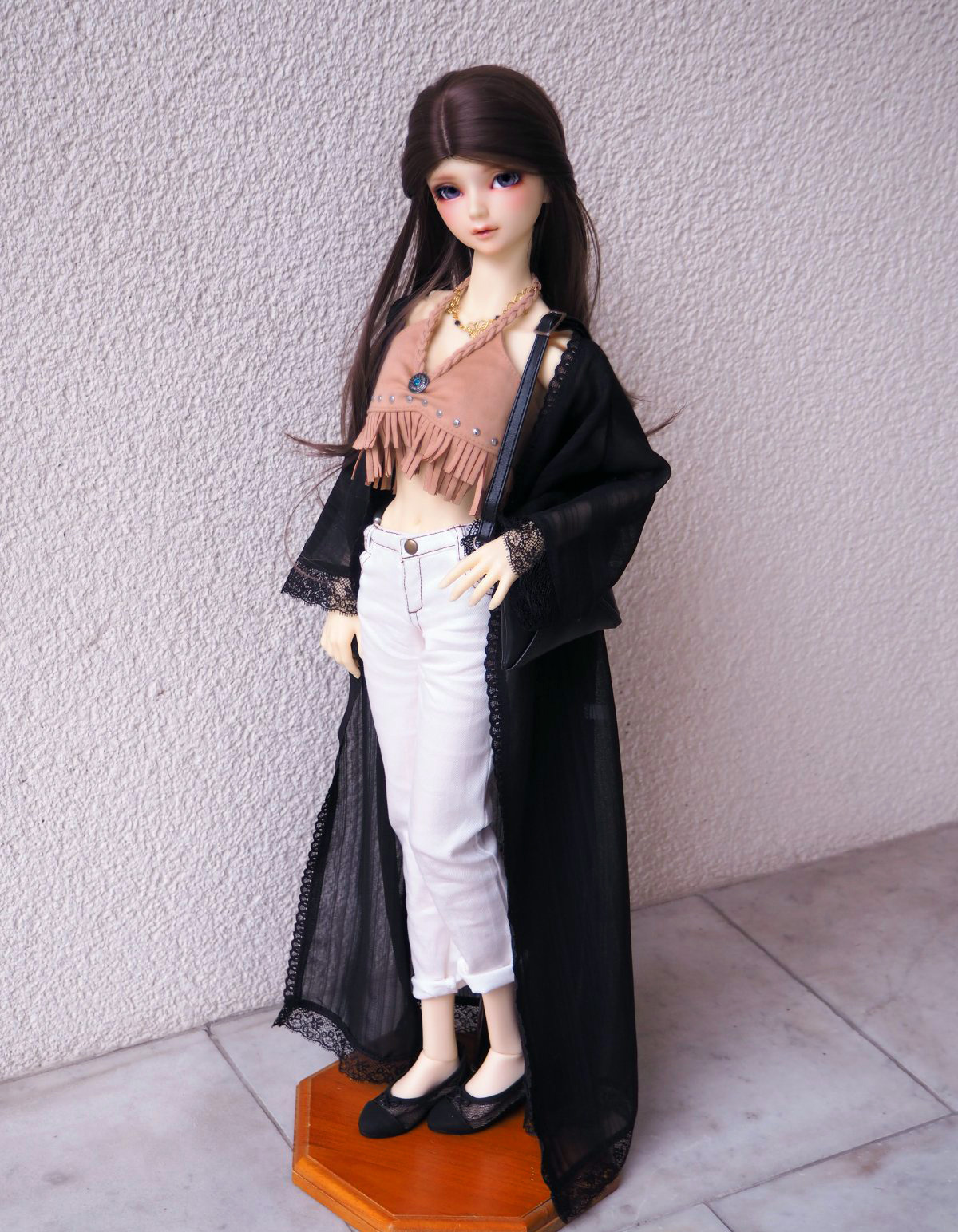 今回は「フォークロアフリンジキャミセット」のキャミソールにシンプルなパンツを合わせ、黒で引き締めてみました。