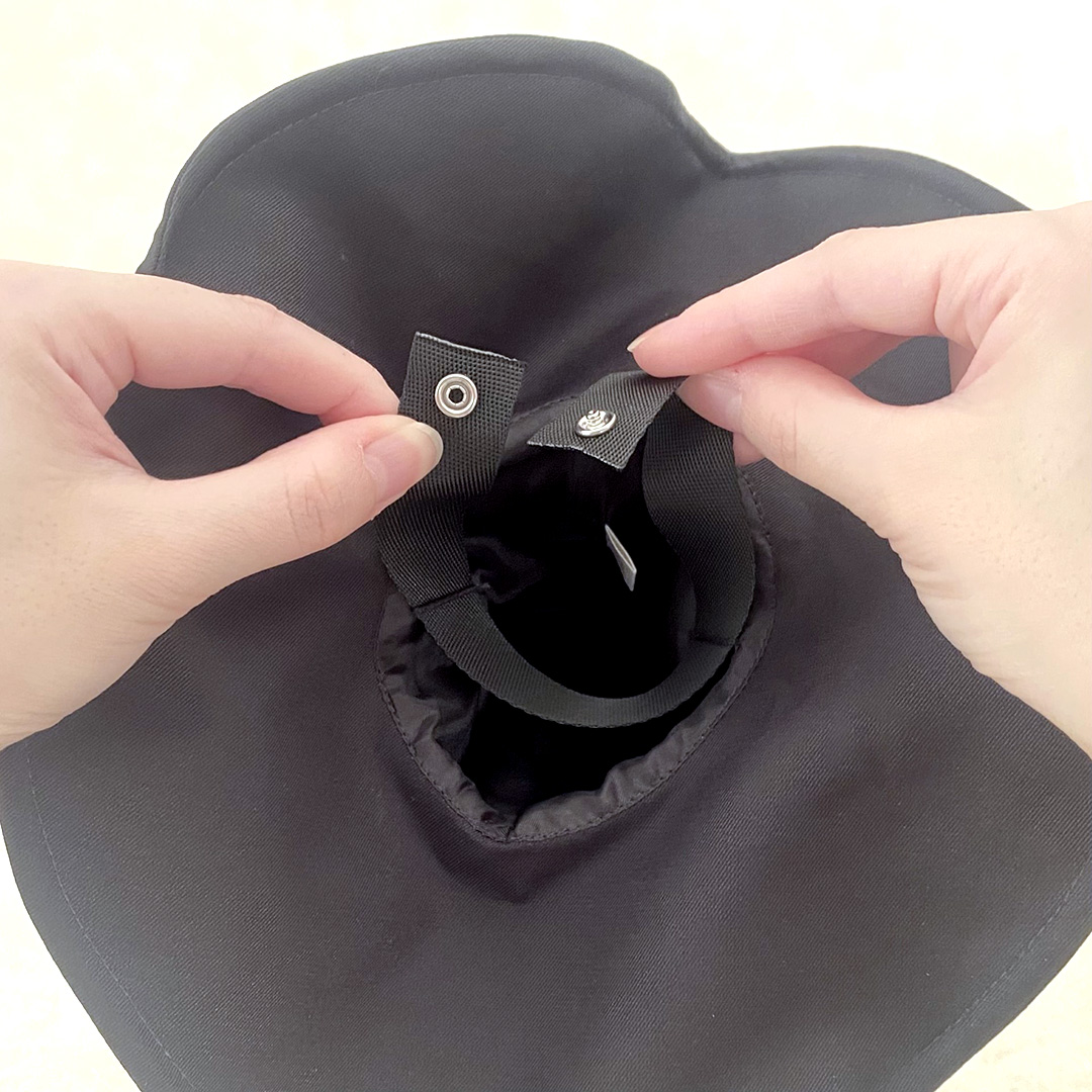 調整用テープを内側に通すことで、SDMの小さなヘッドも対応できるようにしました。SDやDDなどのヘッドに着用させる場合でもヘッドが小さめの場合はそのままご使用いただいて問題ありません。小さく感じる場合はホックを外してから、優しく糸ループから外してくださいね。