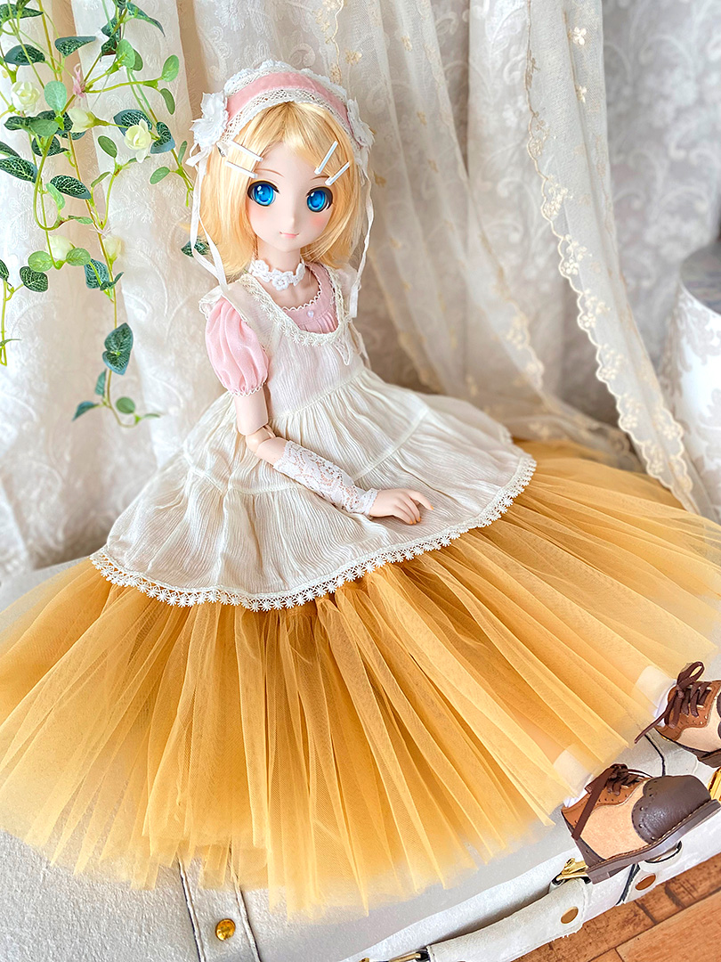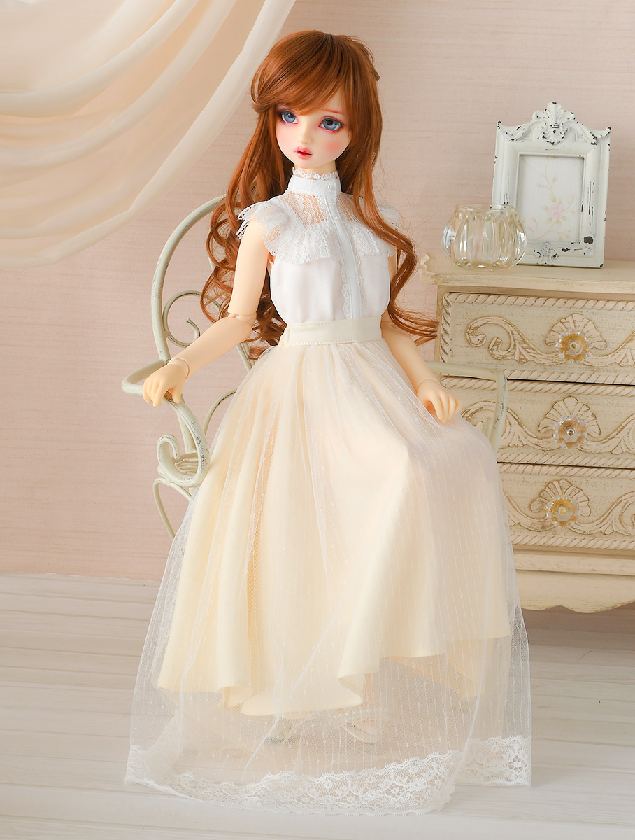 胸元のレースがポイントのブラウスは、涼し気でこれからの季節にぴったり♪甘くなりすぎないように、淡い色合いでまとめました。立ち姿ももちろん可愛いですが、座らせた時の少し長めのチュールスカートの落ち感も素敵ですよ。