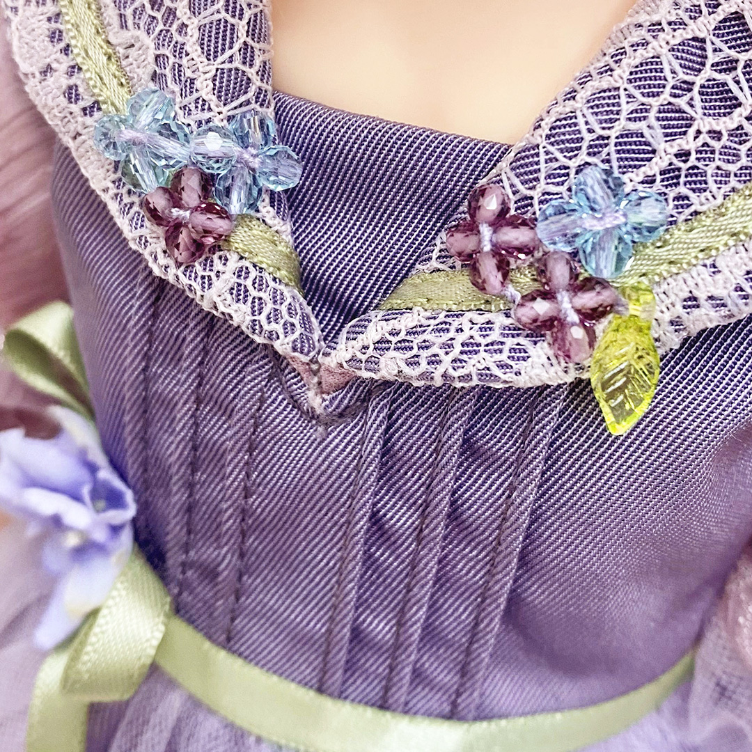 襟もとにあしらった紫陽花はすべて手縫いでお仕立てしています。水色と紫色の紫陽花にアクセントとして葉っぱのビーズをプラス。雨のしずくを帯びたような、きらきらとした輝きはドルフィーのお顔を華やかに演出してくれます✿