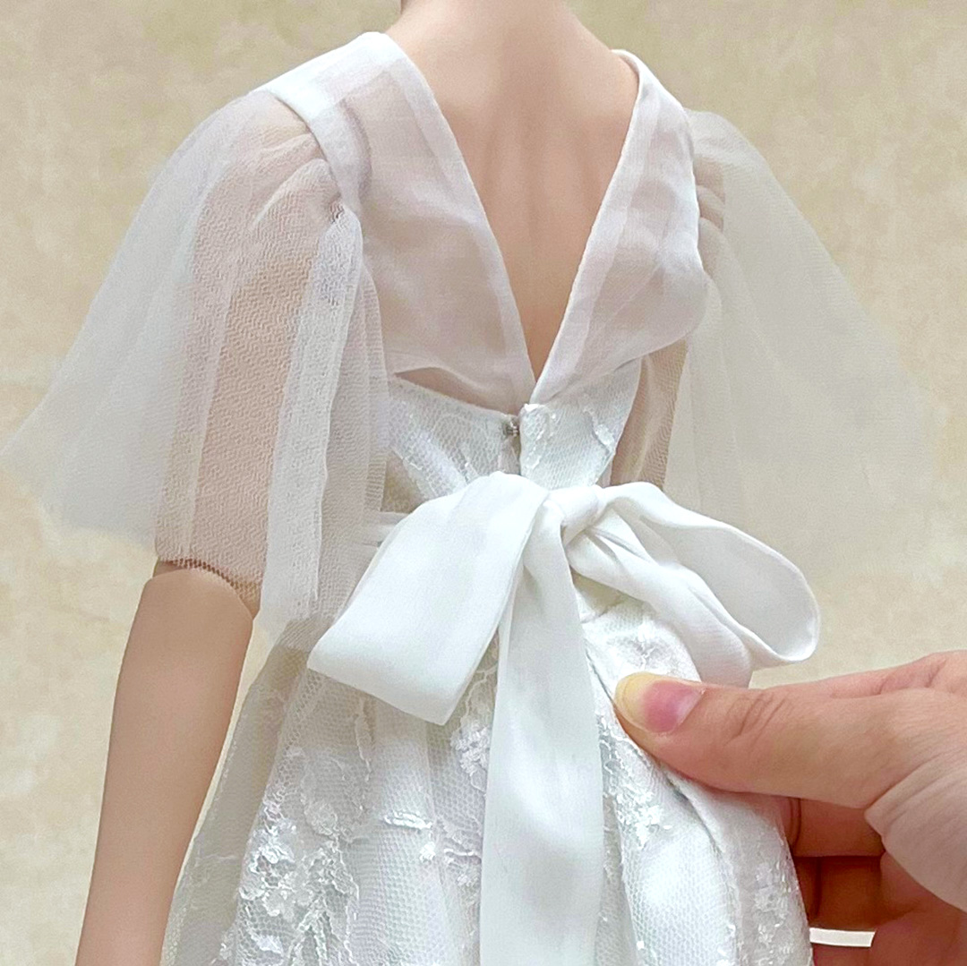 スカートには異なる3枚の生地を重ねているため肌が透けにくく、ふわりと広がります。DDのL胸に着用させる際は、ウエストリボンを結んだ後に背中側の生地を下に下げてあげると、デコルテ周りがフィットし、より美しく着用できますよ。