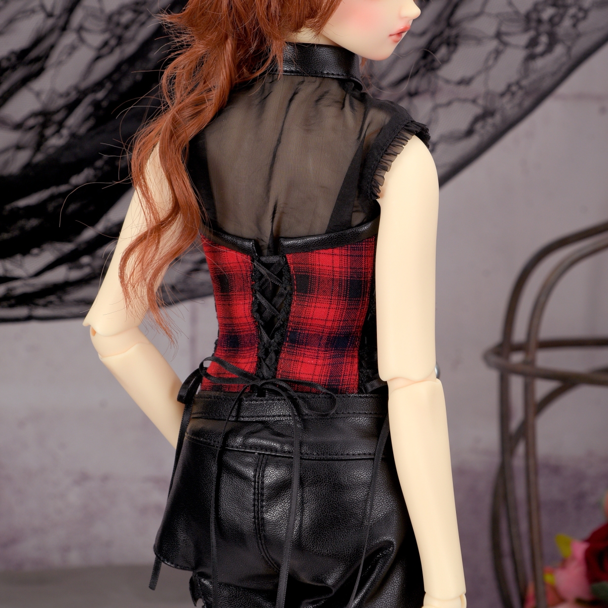 赤いチェック柄がポイントのビスチェは、フロントのファスナーで着脱可能です。後ろの編み上げリボンを締めることで、より身体にフィットし、ボディラインを美しく魅せてくれます。