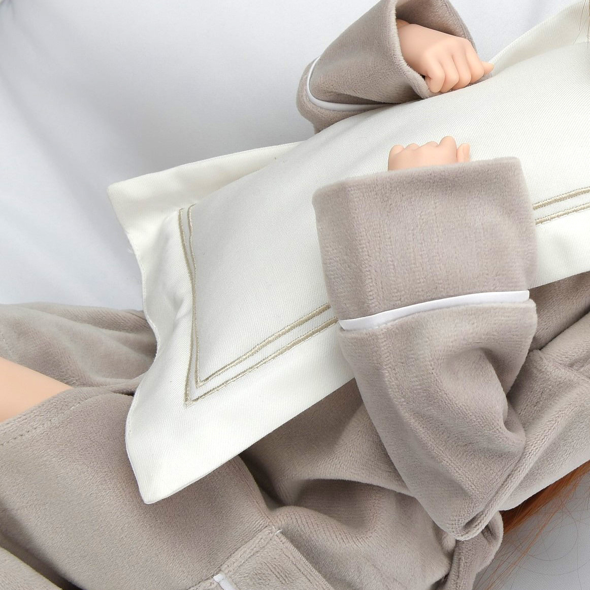 グレーの生地に白いパイピングを加え、今時っぽいお洒落な色合わせにしました。肌触り良いバスローブとふわふわなピローでリラックス雰囲気を演出します。対応サイズが幅広いので、様々なボディサイズのドルフィーに着せてお楽しみいただけます。