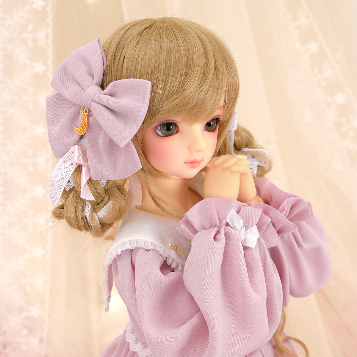 パニエなしでもふんわり広がるワンピースには、たっぷりのレースやキラキラビーズなど、かわいいものをぎゅっと詰め込みました。ヘアアイテムのナイトキャップもコーディネートのポイントに☆大きなリボンは、ブローチピンで着脱できるようになっているので、お好みの場所につけてあげてください♥