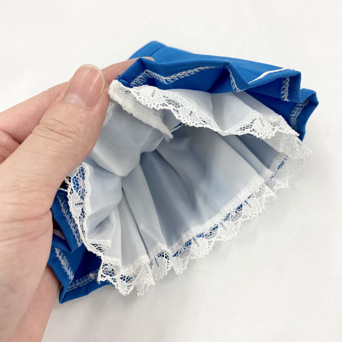 ドルフィーを座らせたり、寝転がせたときに、ポーズが魅力的に見えるようふんだんに生地を使用するデザインにしました。透かしレースの切り替えもポイントです。胸元やおなかを少し見せてアンニュイな着こなしもお楽しみいただけます。