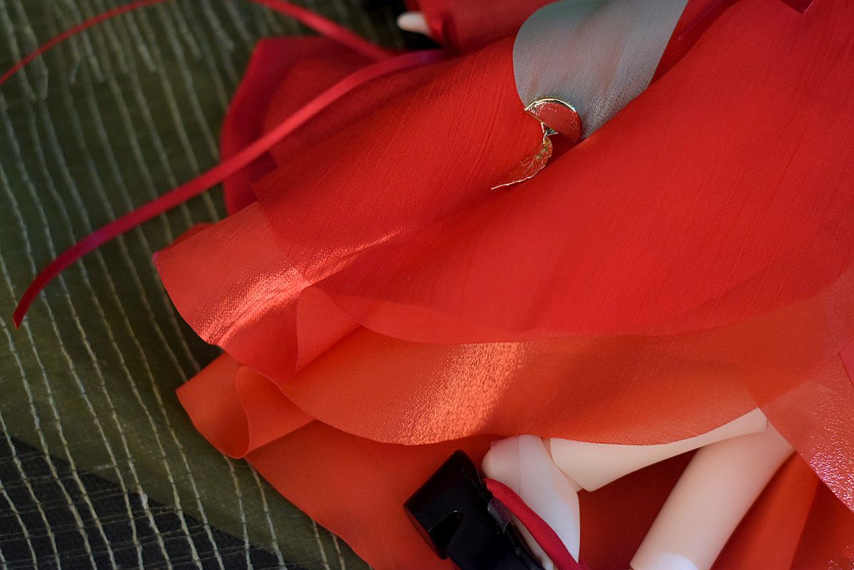 幼SDサイズは「和金」を表現するため、フレアスカートで異なる生地を3枚重ねて作成。同じ赤色でも違う質感の生地を重ねることで、たゆたうヒレの立体感を再現しました。