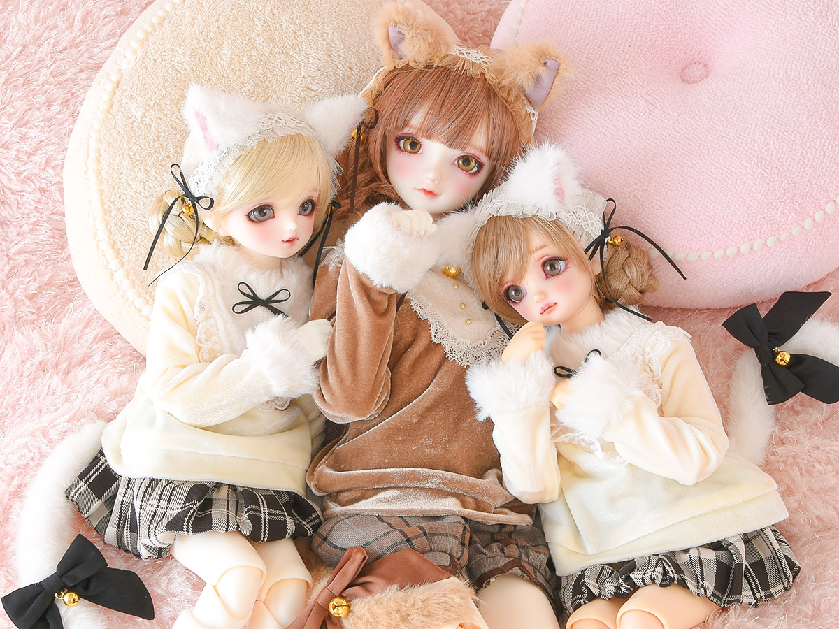 ねこちゃんの柔らかくてふわふわしたイメージを、手触りの良いベロア生地や丸いシルエットのバルーンスカートで表現しました。現在販売中の「ふんわりねこちゃんセット(ブラウン)」と一緒に、SDとSDMおそろコーデにしてあげると、より一層愛おしさが増しますよ。