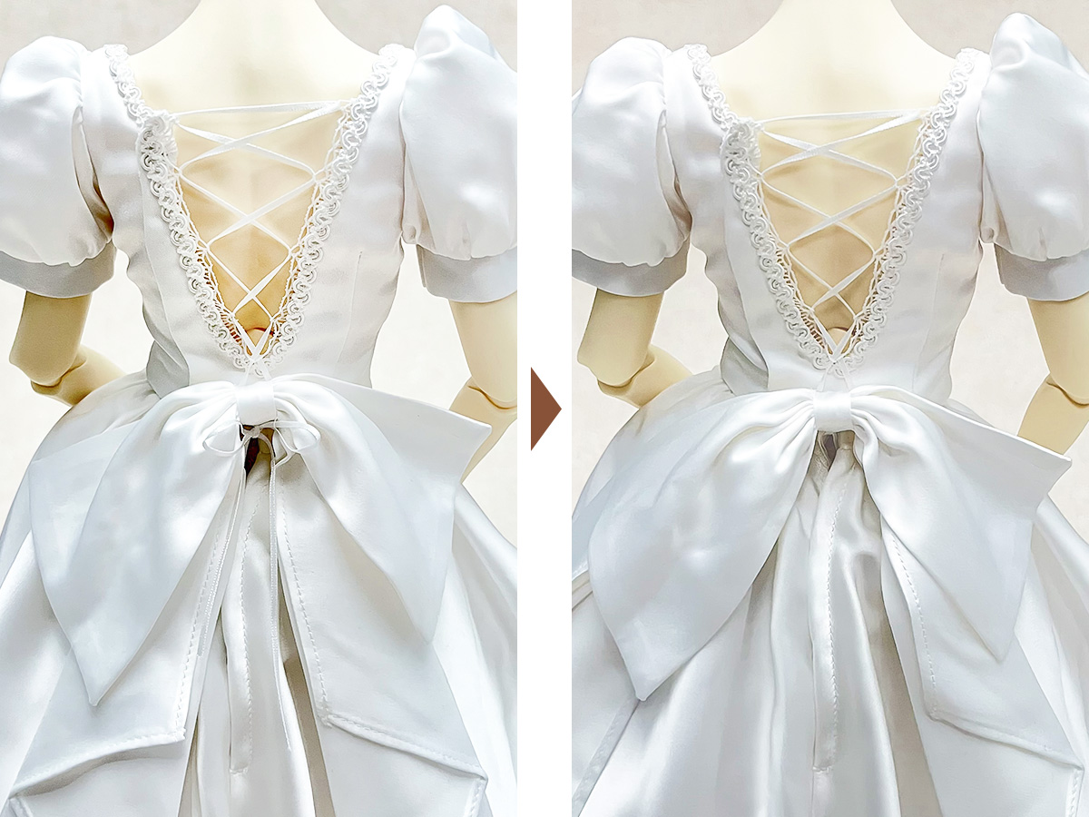 編み上げリボンは、大きな飾りリボンの下で結んでスカートの開き部分から中に入れると綺麗に着用できます。