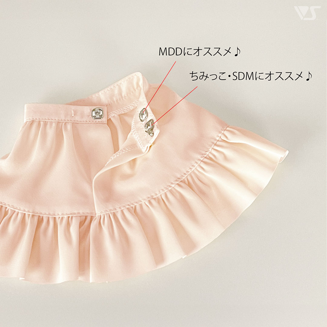 チュニックとスカート丈をミリ単位で丁寧に調整し、MDDが着るとミニワンピ風に、ちみっこDDが着るとふんわりキュートなワンピースになります。スカートのウエスト部分にはサイズ調整ができるスナップ付きで、モデルのウエストサイズに合わせてぴったりフィットしますよ♪